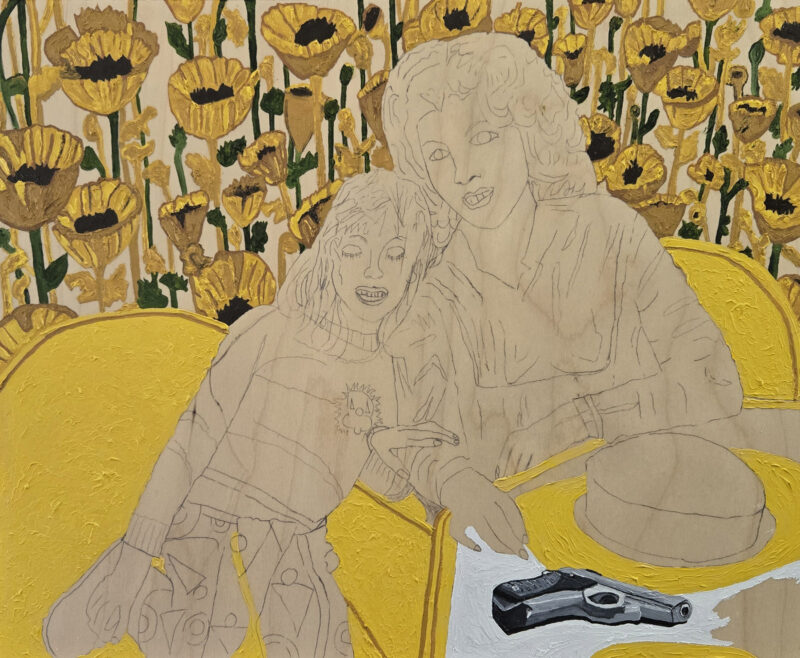 Yesterday, I worked on lots of admin stuff. I didn’t paint. I did this morning, though. I tried to go back to the Frisbee Cake painting, but wouldn’t you know it, the green on the wallpaper hasn’t dried yet, so I smeared a bunch of it while I was painting the gun I drew on the table that my mom is leaning on.