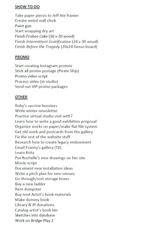 Right now, all my administrative stuff is focused on tying up the end of the year and what I need to start doing for the next few months, as well as projecting the numbers for 2026. It’s not completed yet. I have to take a more detailed tally of my inventory and other crap. I have it all going on a spreadsheet for now. Then, there’s my To-do list, which is not at all organized yet. I only have it broken up into stuff to do for the show, the promo packet project, and everything else about art that’s jumbled together with life tasks.