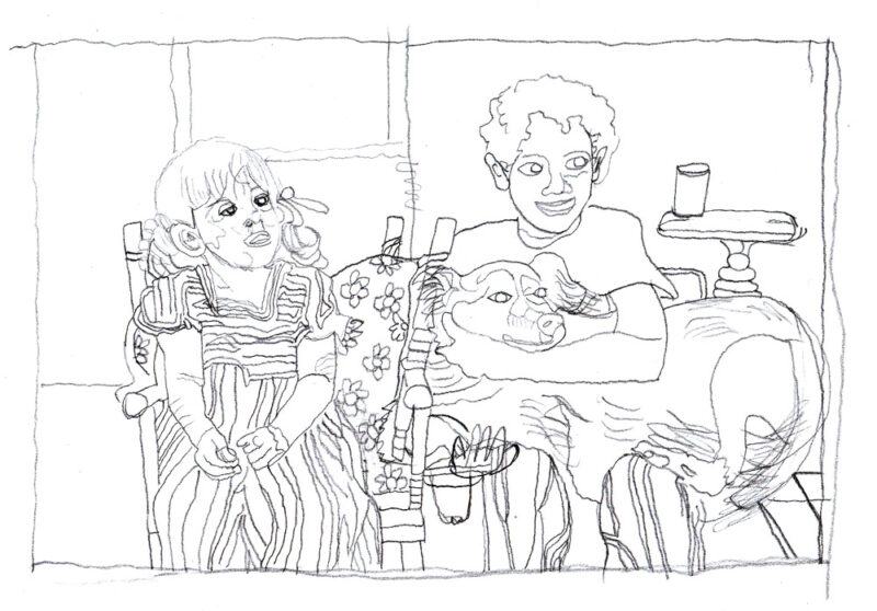 After this new watercolor, I have five more pieces to go. Two of them are watercolors and three are oil paintings. One of the oil paintings hasn’t even been started yet. It’s drawn on the surface (a gessoboard), but no paint has been applied yet. It might be the one I like least. It’s my brother and I as kids with our first dog. We’re also sitting in our custom-made chairs, which my great-grandfather made for us. He was an upholsterer.