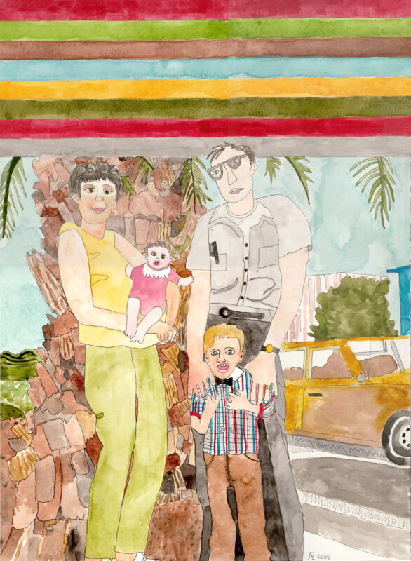 I thought I should use one that had the most family members in it, and that’s the only one. That’s just because of the title of the show: Relative Strangers. The other possibility would be Disorderly Conduct because it has my mom and nana in it. Also, all the faces are fucked up in that one, whereas the watercolor (Young Exemplaries) has my whole immediate family in it (including me) before I got to know them. I didn’t mess up anyone’s face really. I just made everyone look a little funny in a cartoonish way.