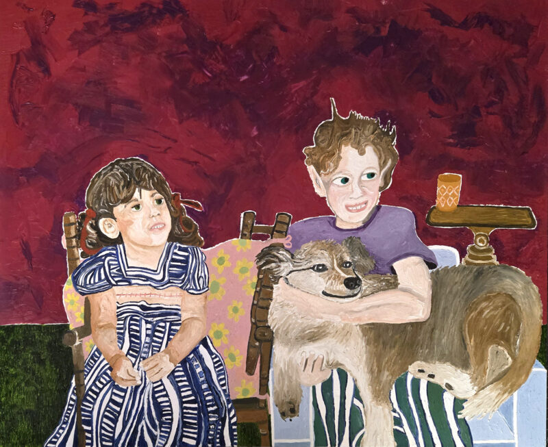 Anyhow, that’s quite enough of all this thinking out loud. On another note, I finished two of the last three paintings for my show, and I’m officially wrapping up the very last one for Relative Strangers. I’m waiting for the last application of paint to tack dry. I painted the whole background a dark, purply red. Once that’s dry enough, I’ll mix a couple of buff colors with white underpaint and cover all that up. Then, I’ll use a toothpick to scratch the surface, creating little grassy patterns for the wallpaper.