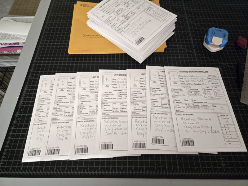 Okay, I’m about half done stuffing the VIP promo envelopes with all the goodies. I’m waiting on one last eBay lot of vintage photo envelopes to arrive. They probably won’t be here until the middle of next week, but they’re good ones, and I’ll just have to impatiently wait. These packages won’t be sent out until 6-8 weeks before the opening. I have lots of time, but I want to get them done so I can focus on the last of the artwork.
