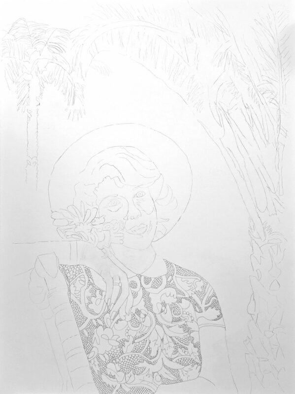 I don’t have too many pieces left to do. It feels like a lot, but I can getter done. I have one more large watercolor and four more oil paintings, plus the framing of the paper pieces. The larger watercolor is of my mother on her wedding day, and the drawing is already on the paper. I did her blouse in ink (so far).